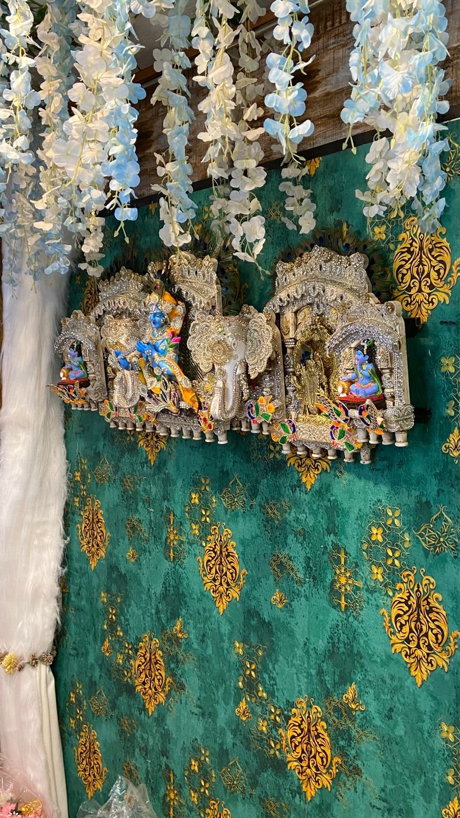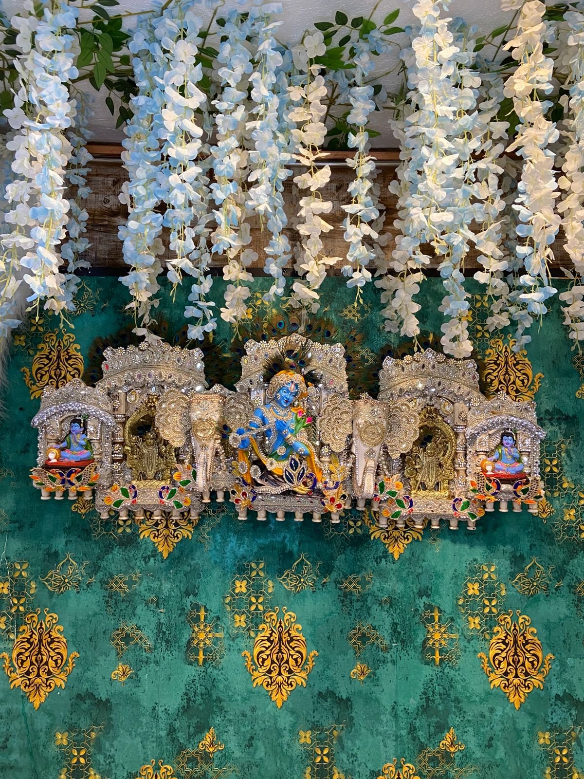 - Background and Aesthetics: The display is set against a rich teal-colored background with gold patterns. White floral garlands hang from the top, adding to the festive and religious aesthetic.