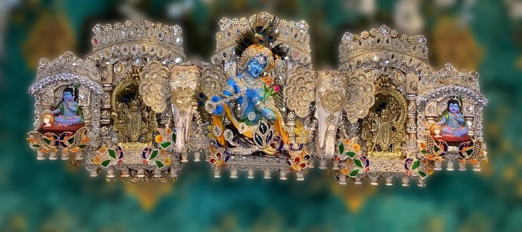 - Central Figure: The centerpiece is a brightly colored idol of Lord Krishna, depicted playing the flute, adorned with elaborate clothing, jewelry, and a peacock feather crown.