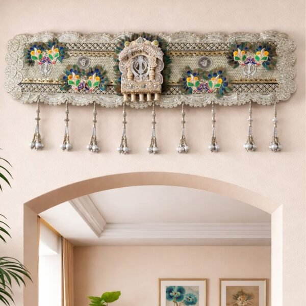 traditional Krishna toran or bandhanwar display. This decorative piece is often used in Hindu homes or temples, particularly during festivals, to welcome guests and symbolize prosperity and good fortune.
